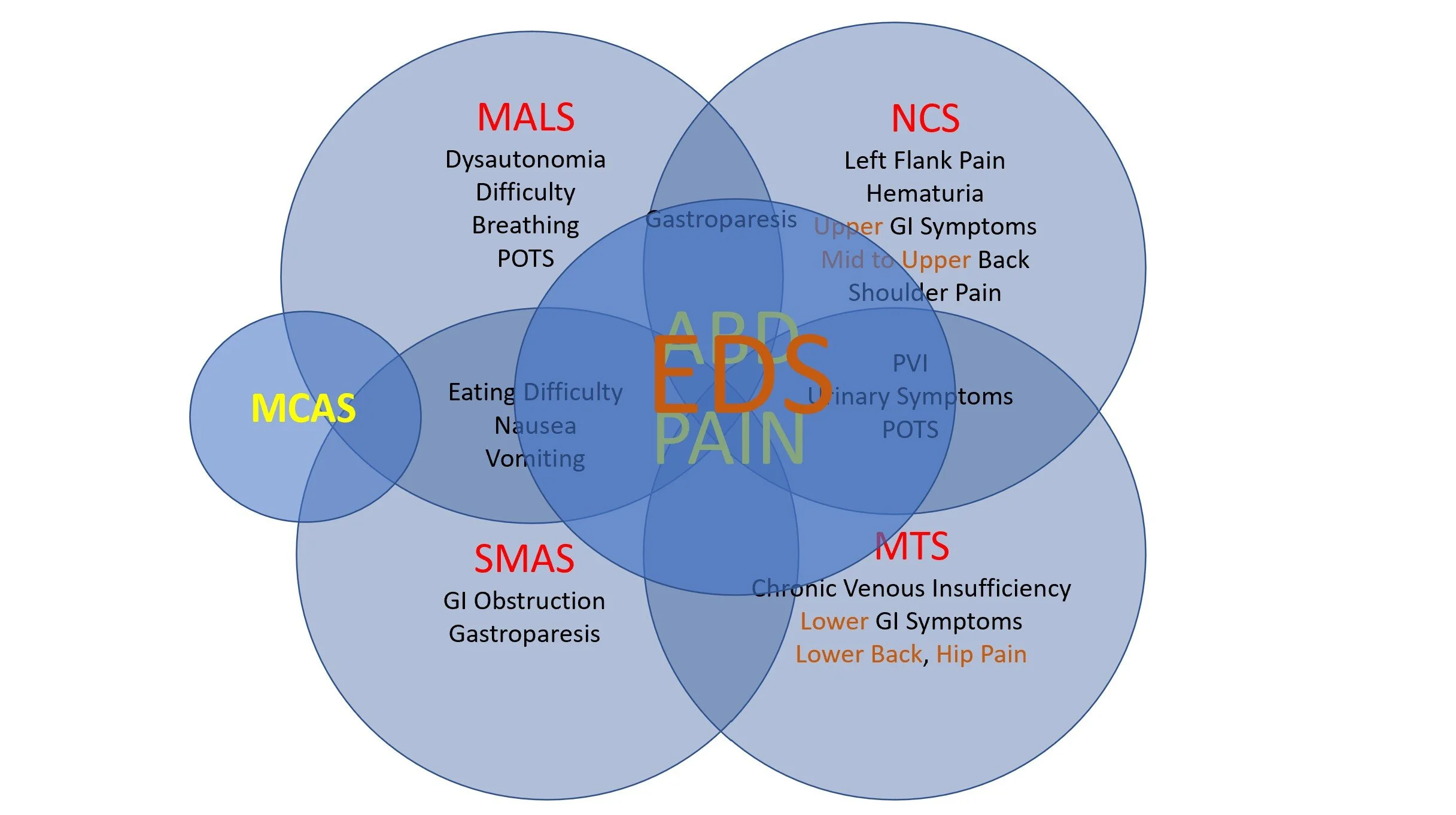Both EDS and MCAS are systemic diseases that affect all parts of our body. Having diagnosis of EDS and/or MCAS alone can cause many symptoms similar to AVCS. The difference is that for AVCS, there’s specific anatomic abnormalities that can be seen on imaging except for the neurogenic version of MALS. As venous or arterial compression seen on images do not always produce the symptoms - permissive compression, it becomes important to understand the typical and atypical presenting symptoms of each of these vascular compression syndromes, as well as having relevant knowledge of EDS and MCAS symptoms in relation to the AVCS as well.